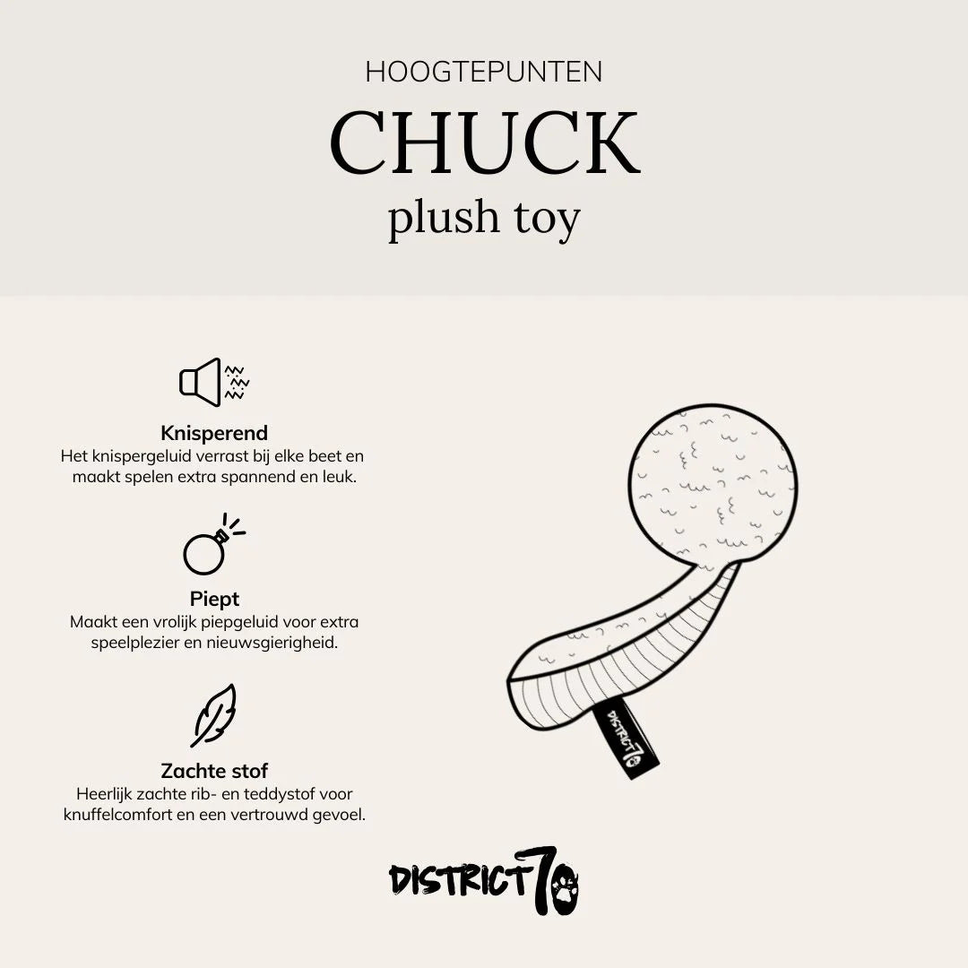 District 70 CHUCK is een multifunctioneel hondenspeeltje dat apporteerspel en knuffelen combineert. Gemaakt van zachte teddy en stevige ribstof, met een ingebouwde pieper en knispergeluid, biedt CHUCK zowel fysieke als mentale stimulatie. Het lichtgewicht ontwerp maakt het geschikt voor interactief spel én zelfstandig gebruik. Door de combinatie van texturen en geluiden blijft het speelgoed langdurig interessant voor honden van alle leeftijden.